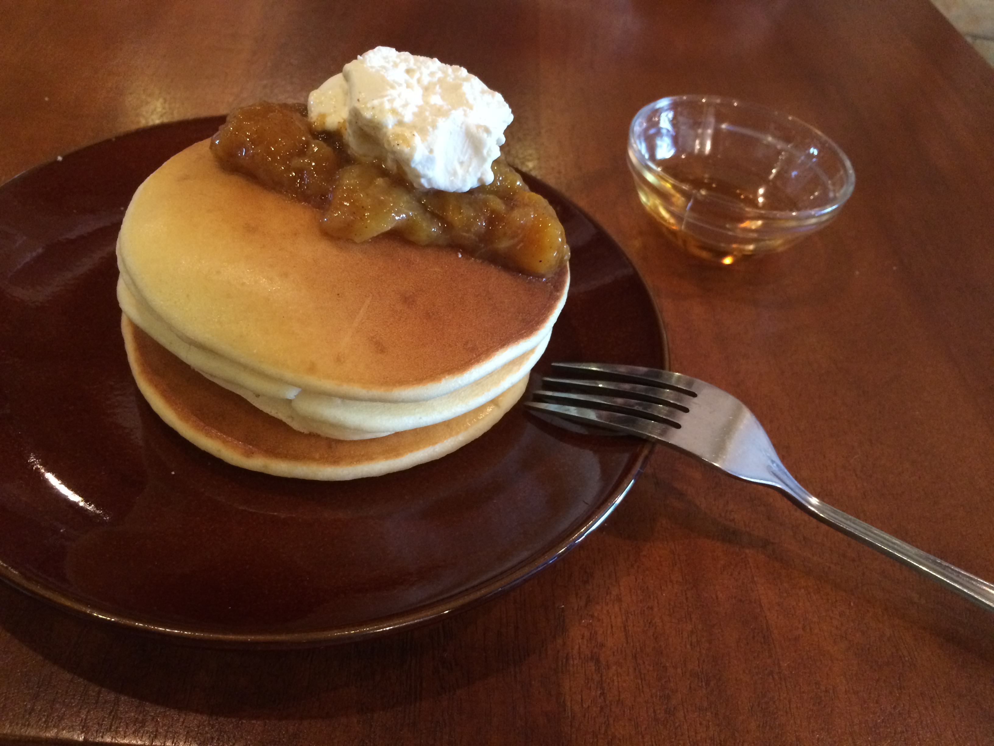 あんずジャムのようなものと、塩バターキャラメルのような白いクリームが乗っており、メープルシロップもついてきました。